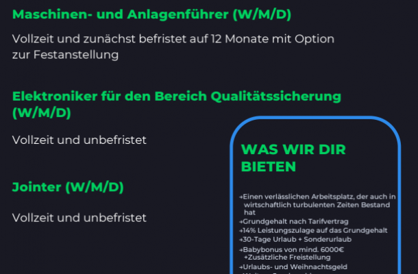 Wir suchen Maschinen- und Anlagenführer (m/w/d), Qualitätsprüfer (m/w/d) und Jointer (m/w/d).